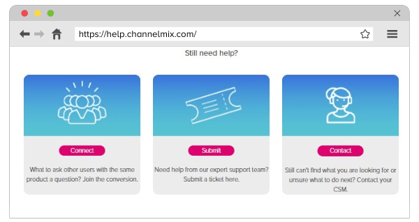 The request for tickets is included at the bottom under “Still Need Help?” to encourage self-service.